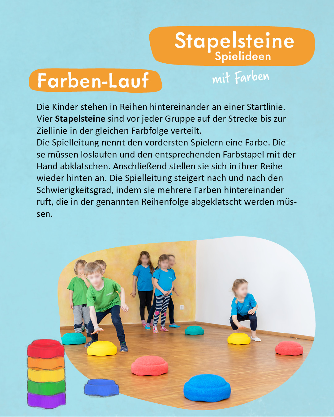 Die Kinder stehen in Reihen hintereinander an einer Startlinie. Vier Stapelsteine sind vor jeder Gruppe auf der Strecke bis zur Ziellinie in der gleichen Farbfolge verteilt.