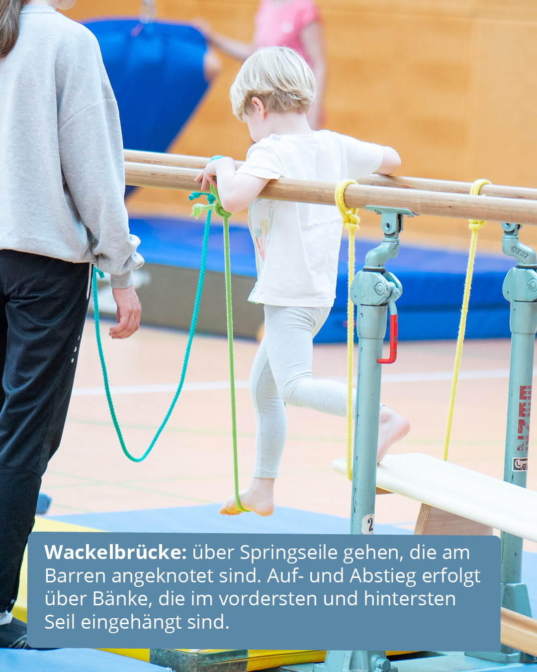 - Wackelbrücke: über Springseile gehen, die am Barren angeknotet sind. Auf- und Abstieg erfolgt über Bänke, die im vordersten und hintersten Seil eingehängt sind.