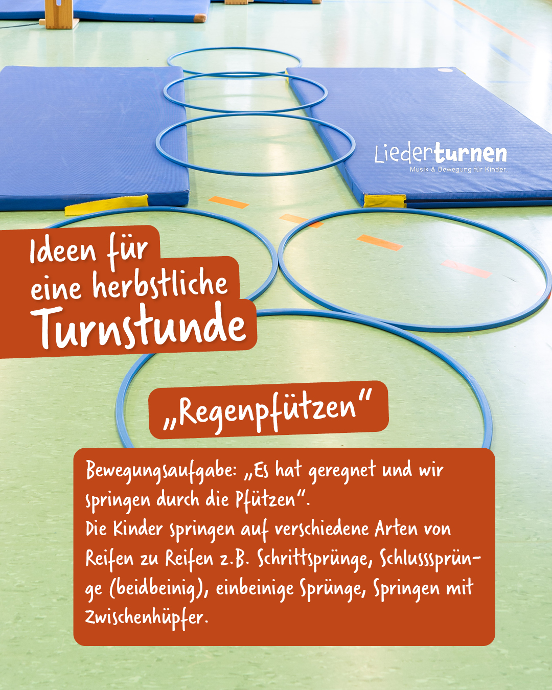 Bewegungsaufgabe: „Es hat geregnet und wir springen durch die Pfützen und über Äste, die der Sturm von den Bäumen gerissen hat.“