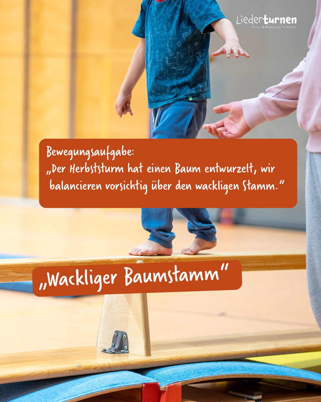 Bewegungsaufgabe: „Der Herbststurm hat einen Baum entwurzelt, wir balancieren vorsichtig über den wackligen Stamm.“