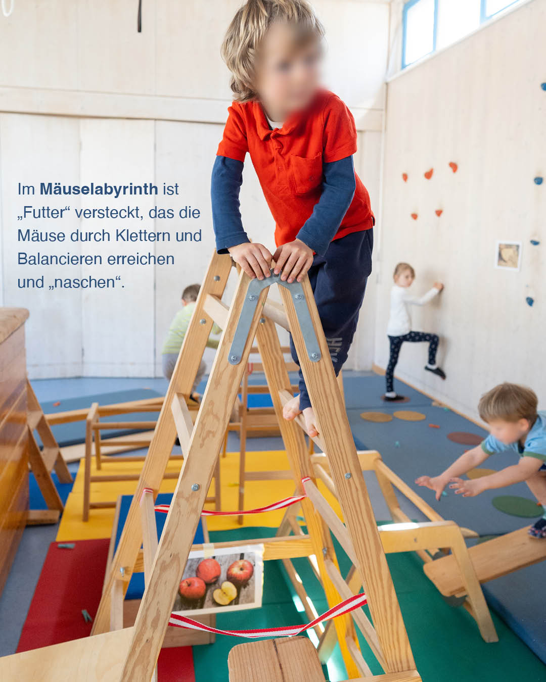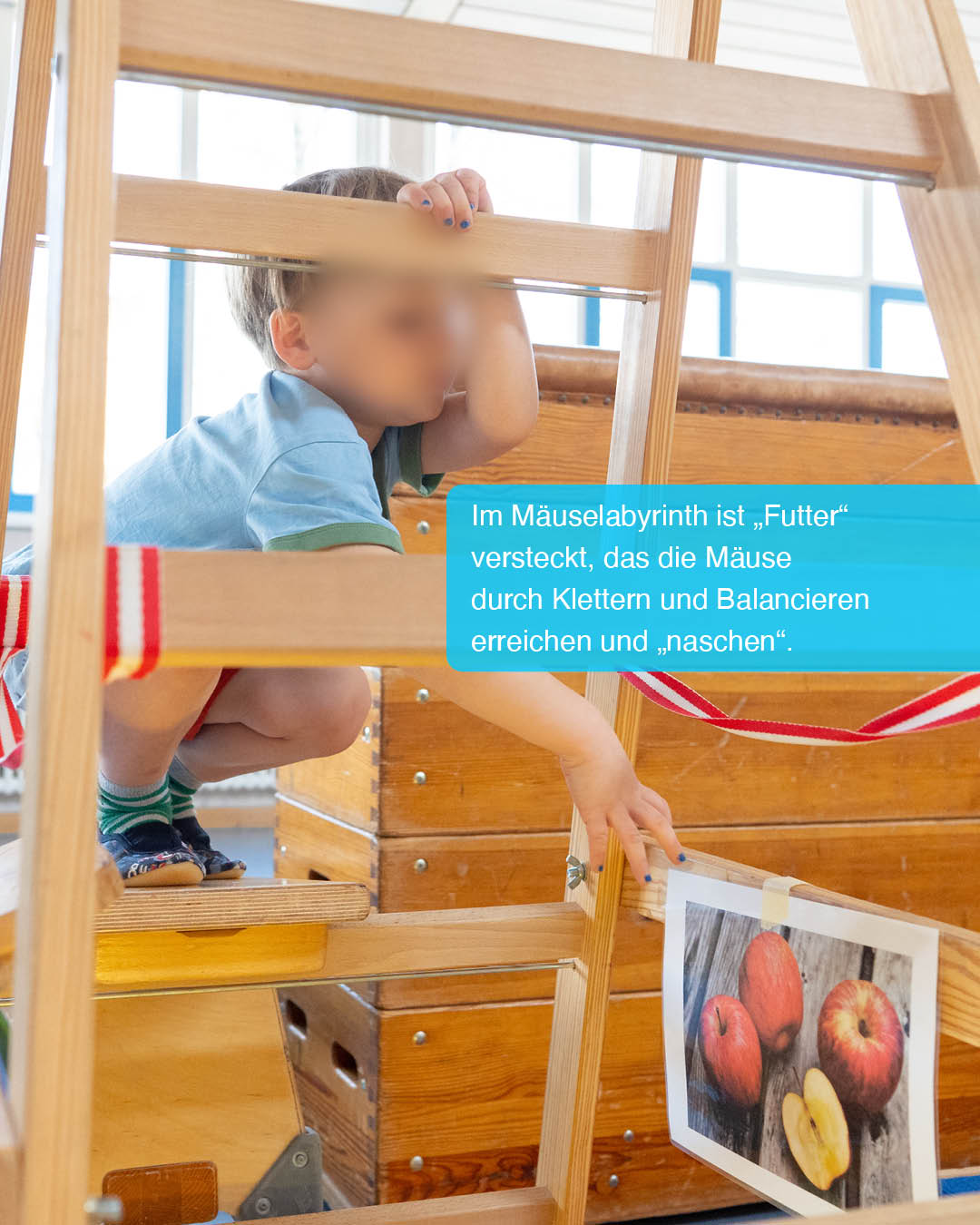 Wie kommen flinke Mäuse in einem Labyrinth aus Leitern, schiefen Ebenen und Turnkästen an ihr Futter? In diesem Parcours verwandeln sich die Kinder in Mäuse und überwinden große und kleine Hindernisse.