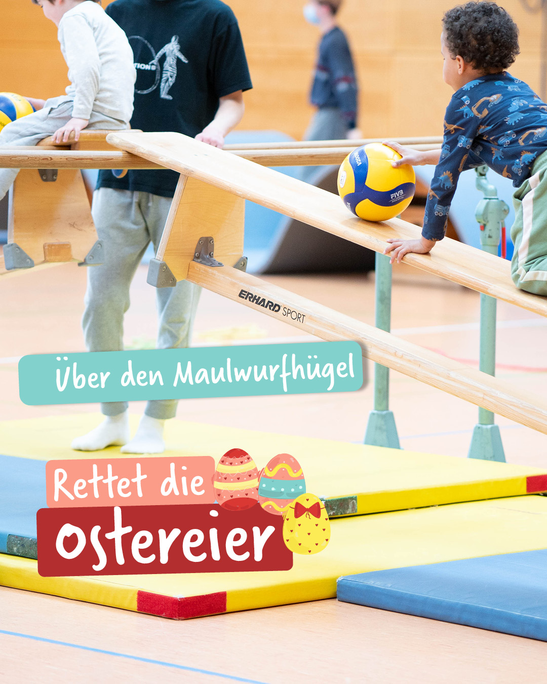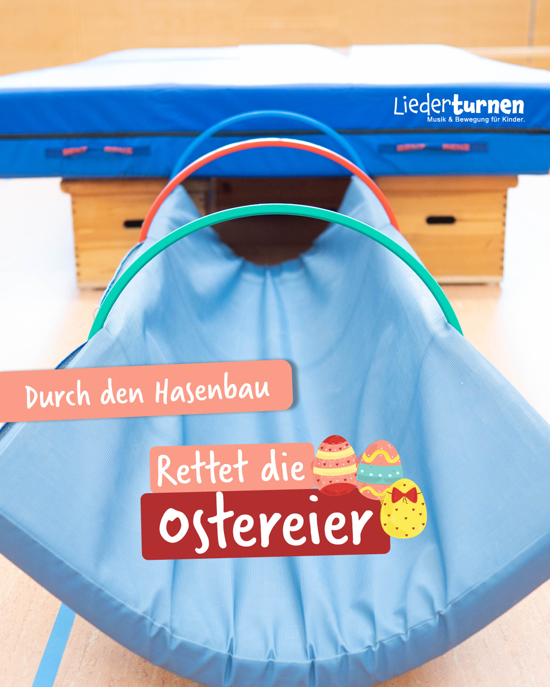 „Der starke Sturm weht alle Eier aus dem Korb und sie kullern den Wiesenhügel hinab. Schnell ihr Osterhasen, wir müssen die Ostereier retten!“ (Der/die ÜL räumt immer wieder die Bälle aus dem Kasten und lässt sie durch den Raum rollen, während die Kinder die Bälle wieder zurückbringen.)