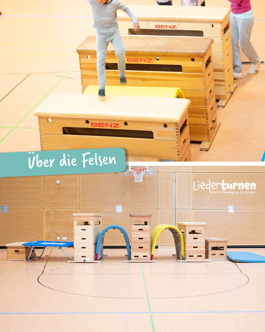 - Über die Hügel (Schwingen an Ringen von Kasten zu Kasten.) Über die Felsen (Vom Mini-Tramp auf einen Kasten hüpfen und über Matten und Kästen klettern.)