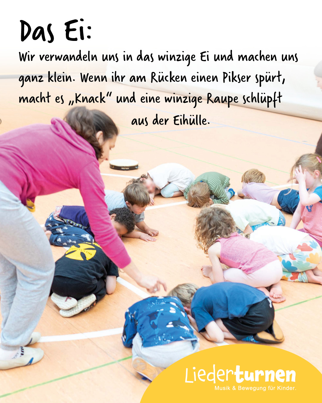 Wir verwandeln uns in das winzige Ei und machen uns ganz klein. Wenn ihr am Rücken einen Pikser spürt, macht es „Knack“ und eine winzige Raupe schlüpft aus der Eihülle.