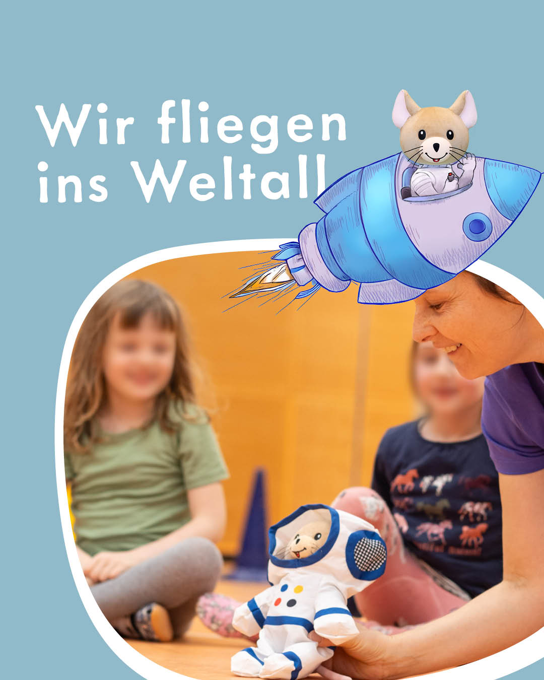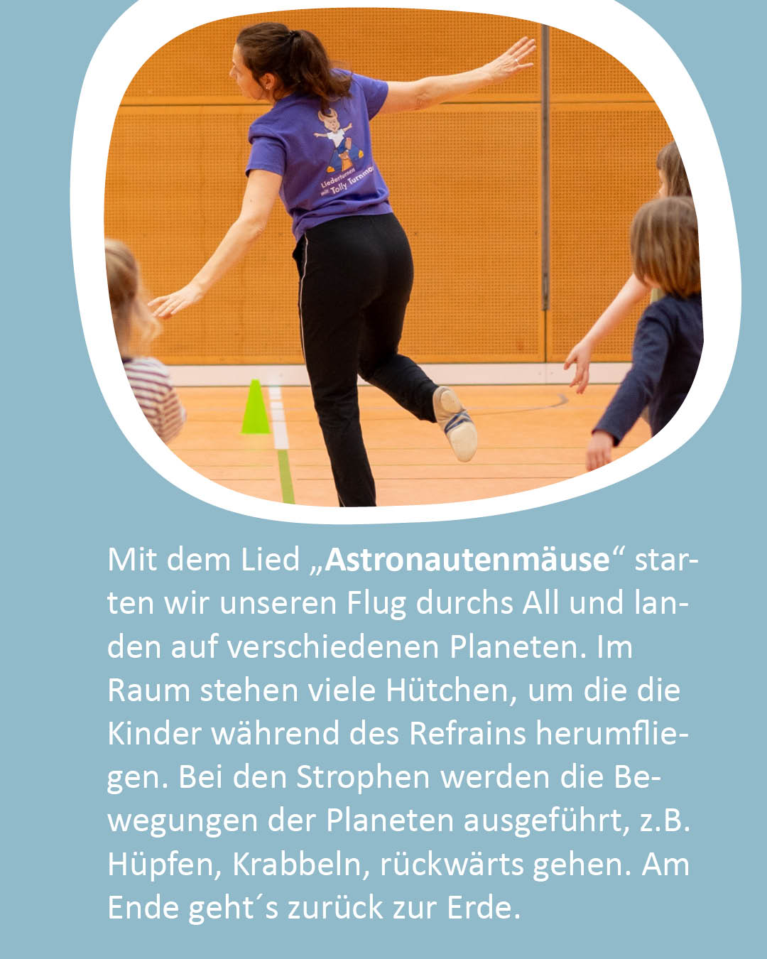 Mit dem Lied „Astronautenmäuse“ starten wir unseren Flug durchs All und landen auf verschiedenen Planeten. Im Raum stehen viele Hütchen, um die die Kinder während des Refrains herumfliegen. Bei den Strophen werden die Bewegungen der Planeten ausgeführt, z.B. Hüpfen, Krabbeln, rückwärts gehen. Am Ende geht´s zurück zur Erde.