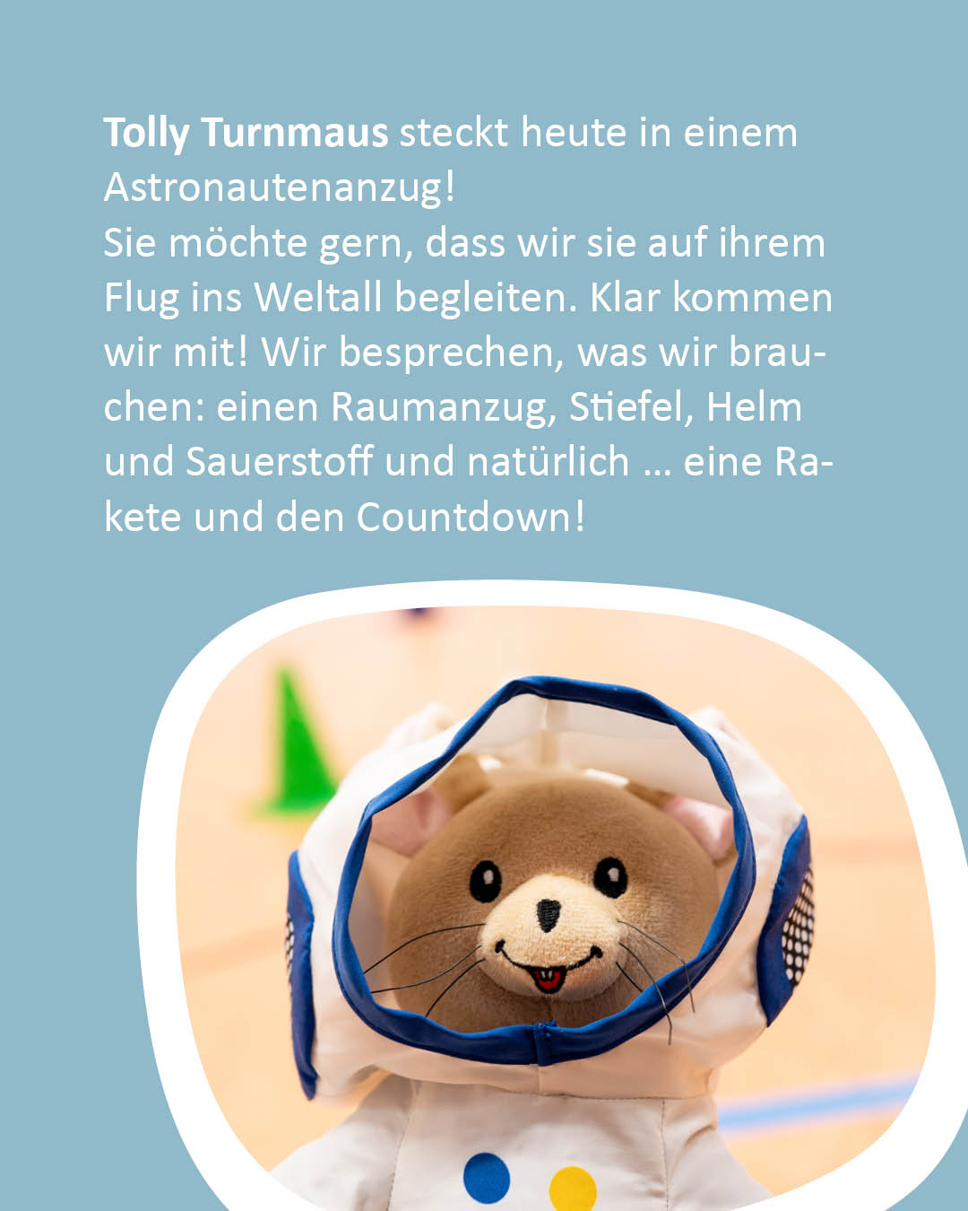 Tolly Turnmaus steckt heute in einem Astronautenanzug! Sie möchte gern, dass wir sie auf ihrem Flug ins Weltall begleiten. Klar kommen wir mit!
