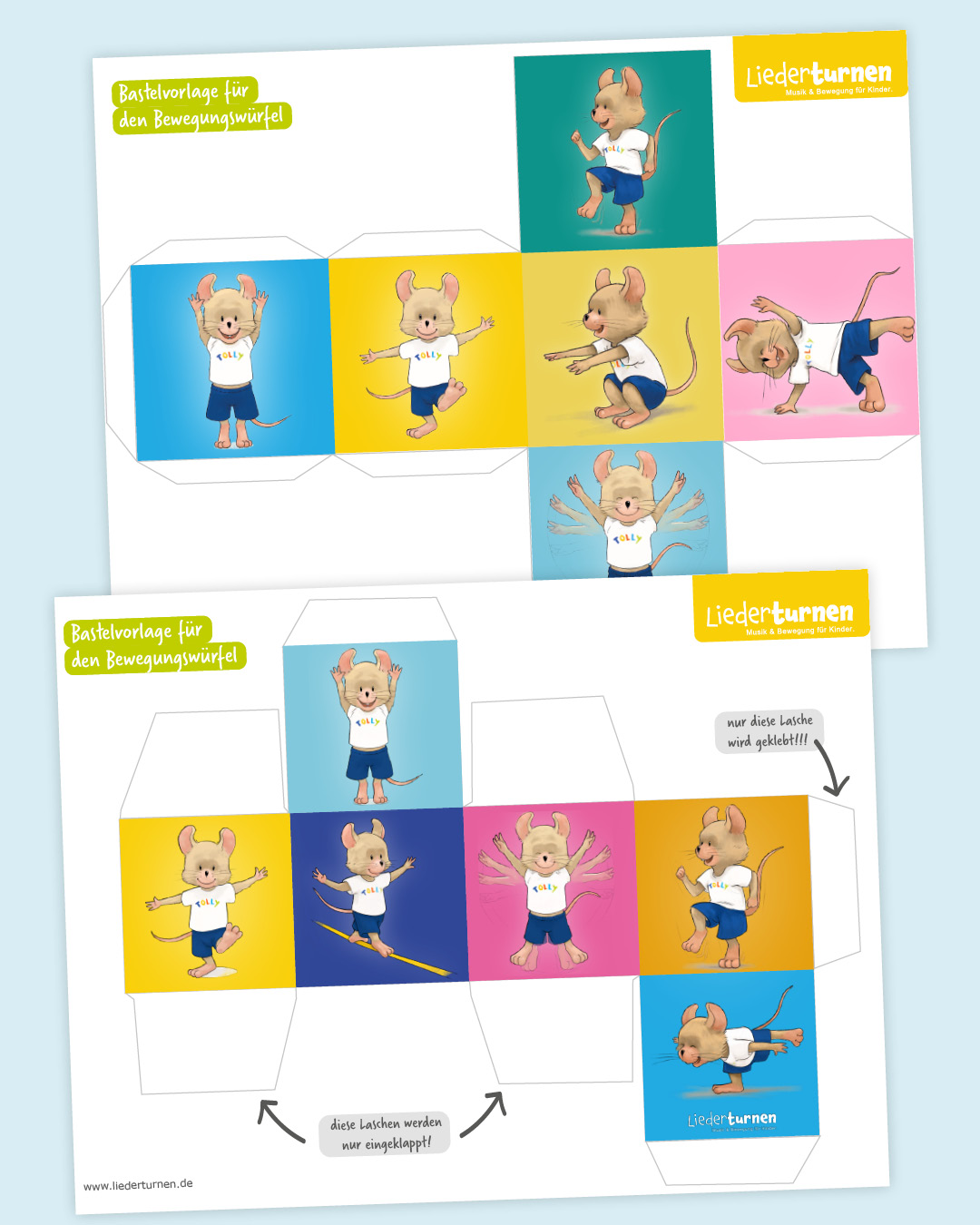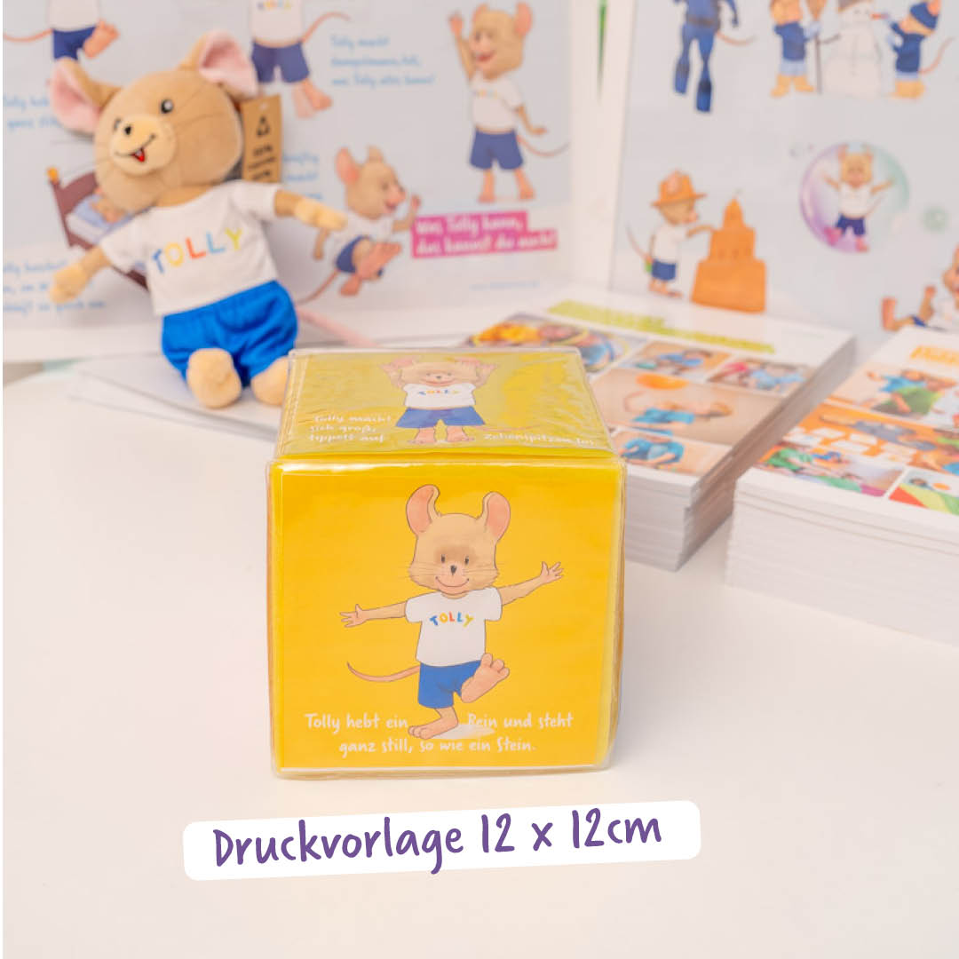 Die Abbildung verknüpft die Tolly-Bewegungen mit Würfelaugen. Daraus lassen sich lustige Würfelspiele ableiten. Neben unseren Spielvorschlägen, soll das Plakat auch Groß und Klein dazu anregen, eigene Spielformen zu erfinden.