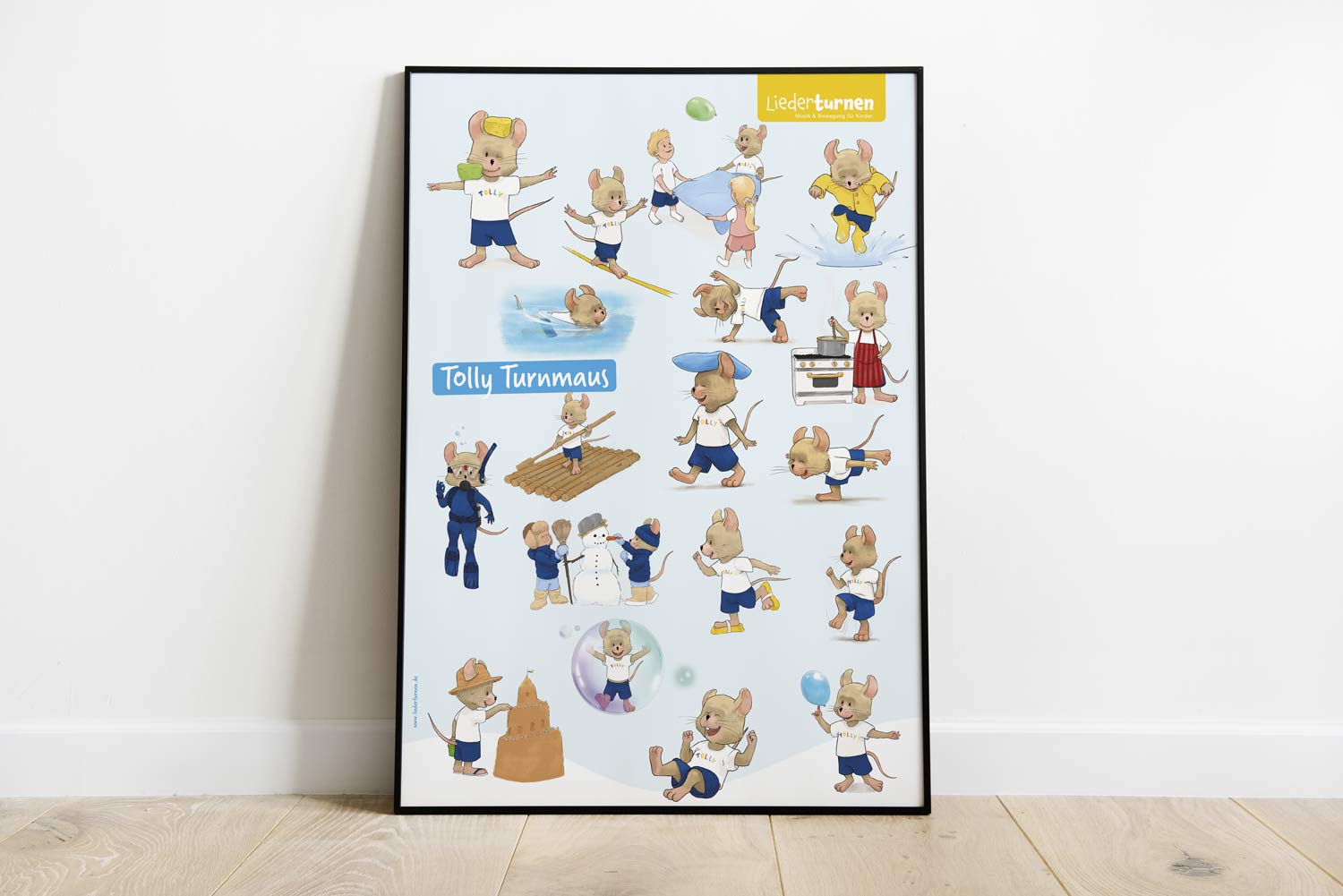 Auf diesem Plakat finden sich Abbildungen, die einige Szenen aus Liedern der Liederturnen-CD und der Postkarten-Abenteuer von Tolly Turnmaus darstellen. Sie regen die Fantasie der Kinder an, ermuntern sie zum Sprechen und eignen sich zur Einführung und Reflexion der Lieder und Postkarten-Abenteuer.