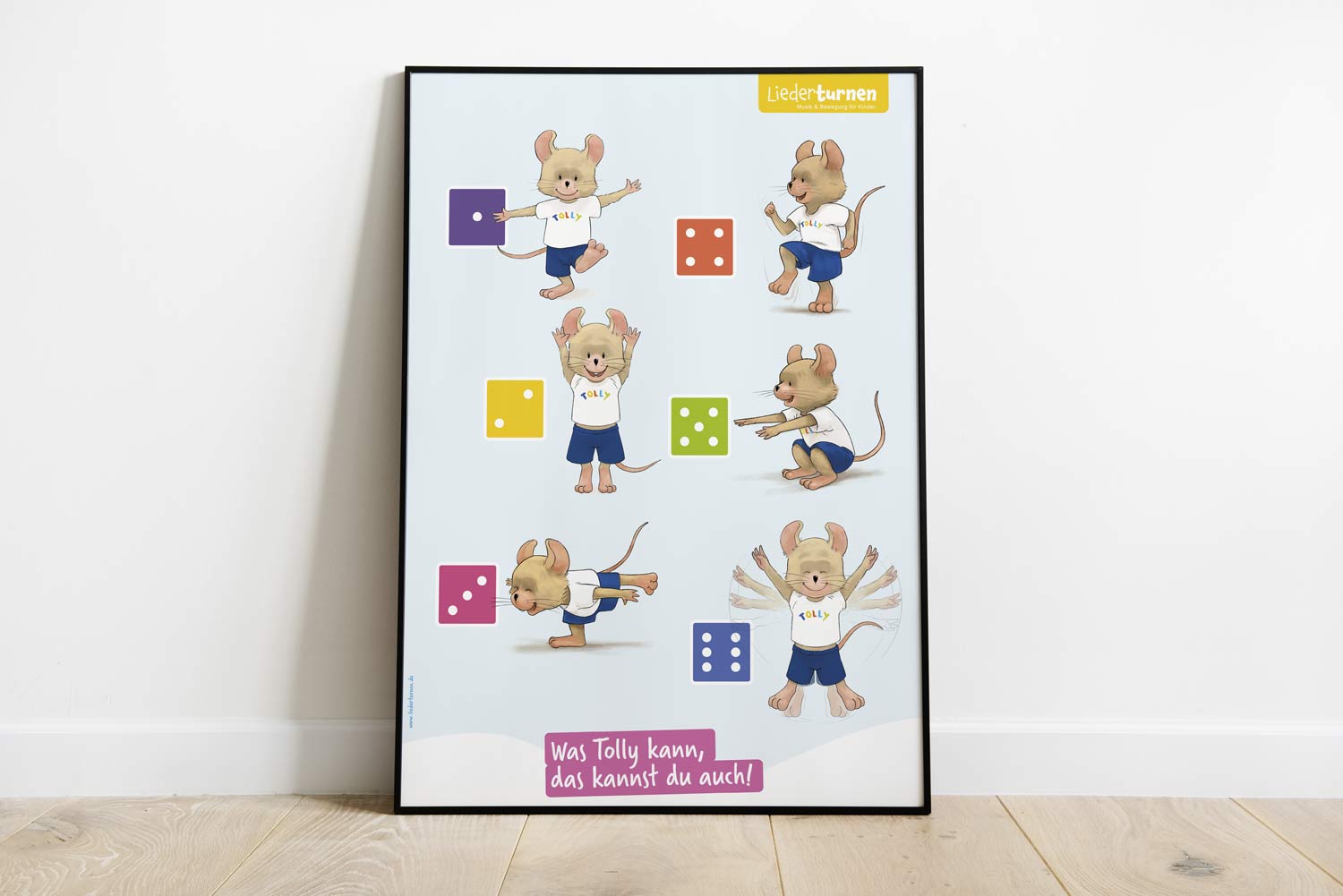 Dieses Plakat illustriert die vier Strophen des Tolly Turnmaus-Liedes. Es eignet sich zum Kennenlernen von Tolly Turnmaus und zur Vorstellung der Tolly-Bewegungen bei der Liedeinführung.