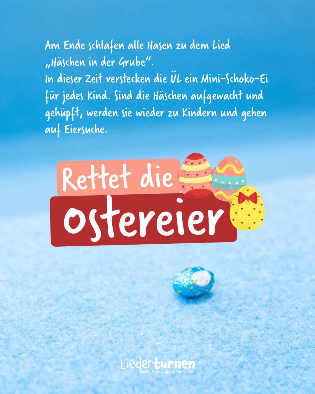 Am Ende schlafen alle Hasen zu dem Lied „Häschen in der Grube“. In dieser Zeit verstecken die ÜL ein Mini-Schoko-Ei für jedes Kind. Sind die Häschen aufgewacht und gehüpft, werden sie wieder zu Kindern und gehen auf Eiersuche.