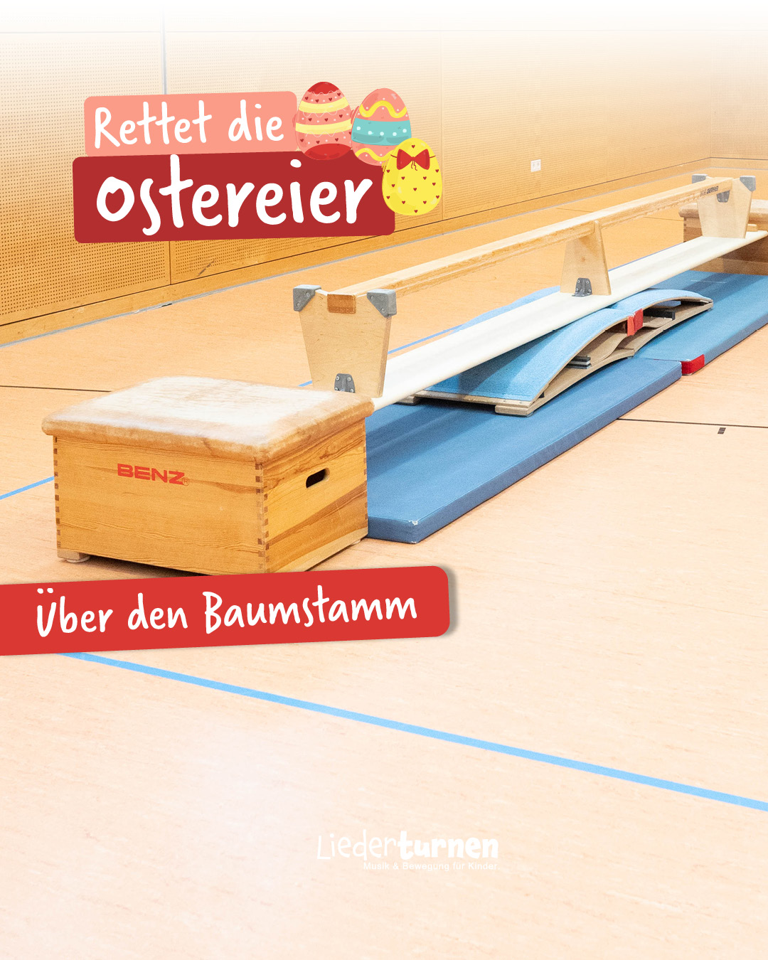 - Über den Baumstamm (Balancieren über eine schmale Bank, die auf zwei Sprungbrettern aufliegt.)