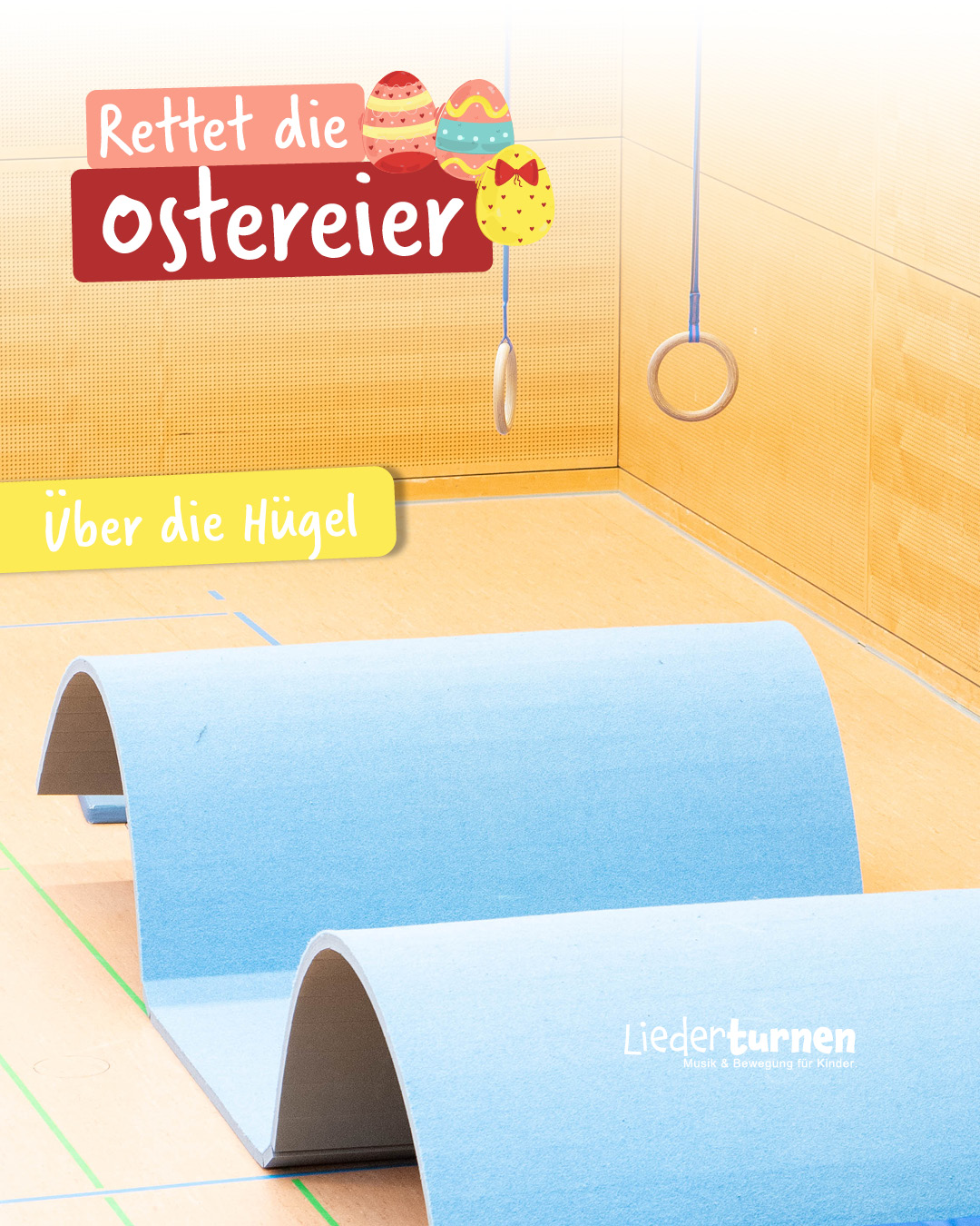 - Über die Hügel (Schwingen an Ringen von Kasten zu Kasten.) Über die Felsen (Vom Mini-Tramp auf einen Kasten hüpfen und über Matten und Kästen klettern.)