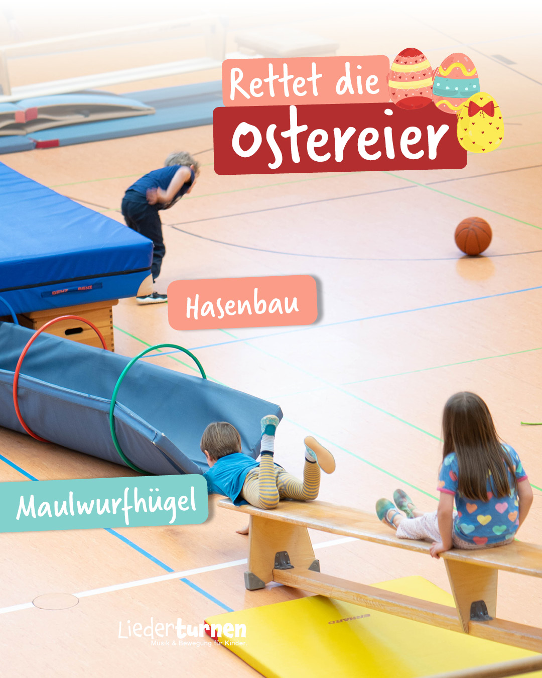 „Der starke Sturm weht alle Eier aus dem Korb und sie kullern den Wiesenhügel hinab. Schnell ihr Osterhasen, wir müssen die Ostereier retten!“ (Der/die ÜL räumt immer wieder die Bälle aus dem Kasten und lässt sie durch den Raum rollen, während die Kinder die Bälle wieder zurückbringen.)